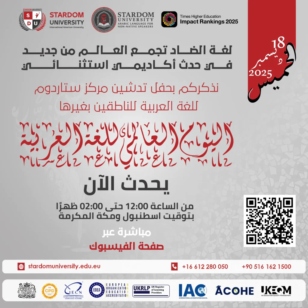 احتفالًا بـ اليوم العالمي للغة العربية، تتشرّف جامعة ستاردوم بدعوتكم للانضمام إلى البث المباشر لحفل تدشين مركز ستاردوم للغة العربية للناطقين بغيرها، في فعالية تجمع نخبة من الأكاديميين والخبراء الدوليين.